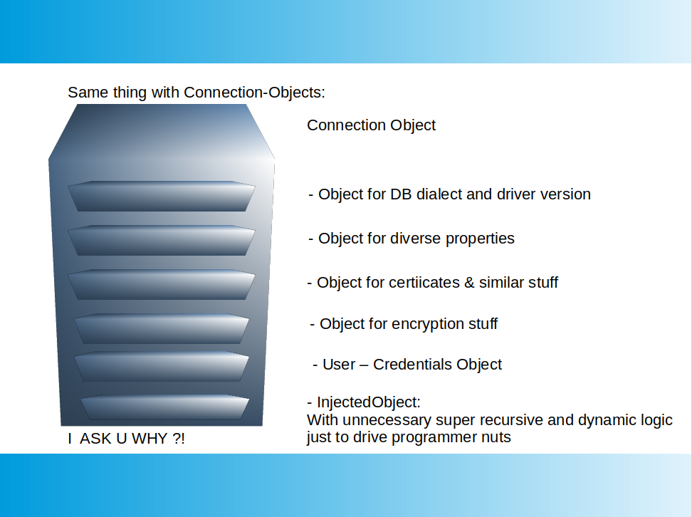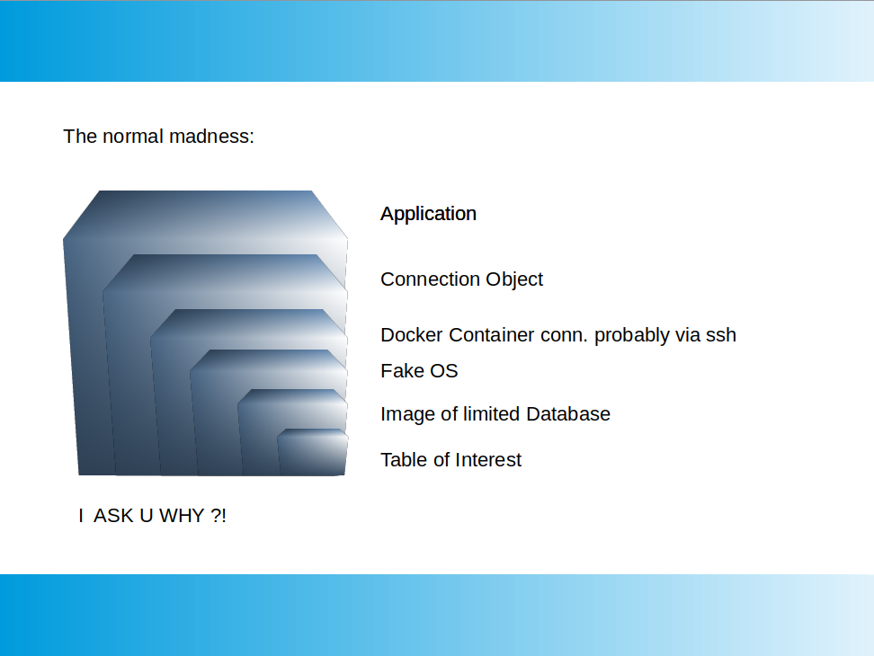 Are U too TOTALLY ANNOYED processing PAAGES of preinstall-instructions SIGN BY SIGN, before you finally can fire the first "Select * from Dual" (or the like) ? Cryptic config files wich leads to more config files wich leads to .. And Da-- - we know what happen if SOMETHIN is wrong ;)